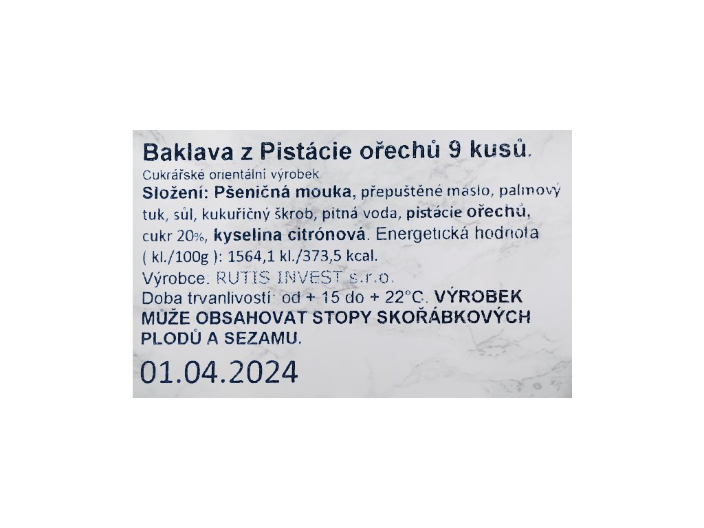 Skladujte v chladu a na suchém místě, do 20 °C a do 60 % vlhkosti. Po otevření skladujte v lednici. Složení:pšeničná mouka, přepuštěné máslo, palmový tuk, sůl, kukuřičný škrob, pitná voda, pistácie kousky drcené, cukr (20 %), kyselina citrónová.