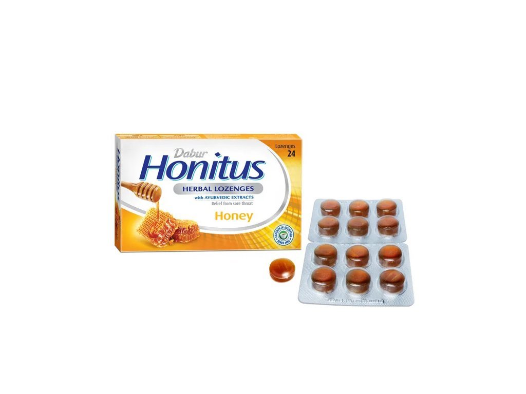 Dabur Honitus Bylinné pastilky na hrdlo Expert Med. Doplněk stravy. Složení: Cukr, Kukuřičný sirup, Med, Mentol, Medová příchuť, Extrakt z plodů angreštu (Amla - Phyllantus emblica), Extrakt z kořene lékořice (Lgycyrhiza glabra), Extrakt z rhizonu zázvoru (Zingiber officinalis), Extrakt z rhizonu kurkumy (Curcuma Longa), Voda, Barvivo (Tatrazin, Brown HT).
