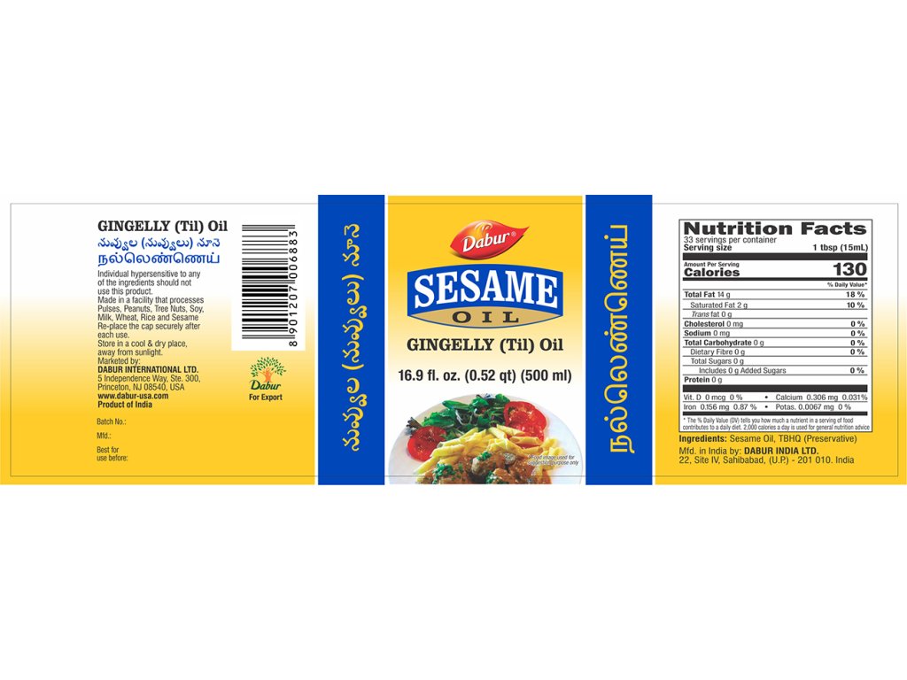 Slovo 'ennai', které znamená v tamilštině "olej", má své kořeny v tamilských slovech eL(எள்ளு) a nei(னெய்), znamenajících sezam a tuk. Také hindské slovo Tel(तेल) pro olej je odvozeno od sezamového oleje, ze sanskrtského Taila(तैल), což znamená "získaný z Tila(तिल), tedy sezamu. Před rokem 600 př. n. l. používali Asyřané sezamový olej jako potravinu, mazivo a lék, primárně však jen bohatí, protože kvůli obtížnosti získávání byl olej drahý. Sezamový olej je také vhodný na migrény, podporuje hojení ran, příznivě působí na akné a ekzémy. Podporuje srdce a cévy, vyživuje pokožku a vlasy. Je to zdroj skvalenu. Skladujte v temnu a mimo dosah dětí. Po otevření skladujte v lednici. Výrobce: Dabur, Indie Výživové ukazatele ve 100 g výrobku: energetická hodnota 3456 kj/862 kcal, tuky 91,8 g, z toho nasycené 16 g, nasycené sacharidy 0 g, z toho cukry 0 g, vláknina 0 g, bílkoviny 0 g, sůl 0 g.
