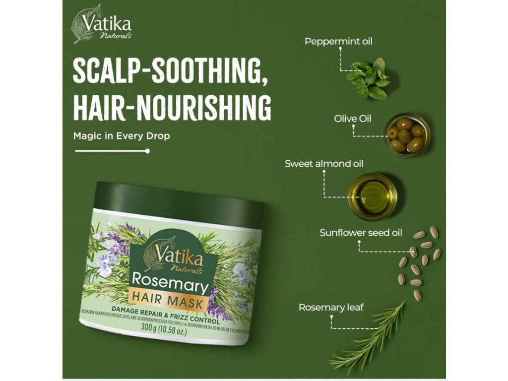 Rozmarýnová maska na vlasy Dabur Vatika Naturals je intenzivní hloubkově vyživující péče, která revitalizuje a posiluje vlasy od kořínků až po konečky. Obsahuje blahodárný rozmarýnový olej, olej ze slunečnicových semínek, sladký mandlový olej, olivový olej a mátový olej. Tyto přírodní složky pomáhají obnovit přirozené pH pokožky hlavy, zajistit hloubkovou hydrataci a zanechat vlasy jemné, snadno upravitelné a svěží. Bohatá hydratační receptura poskytuje vlasům nezbytnou péči pro jejich zdravější a silnější vzhled.