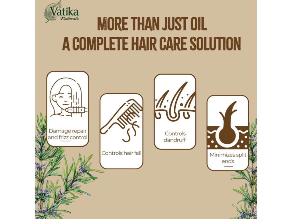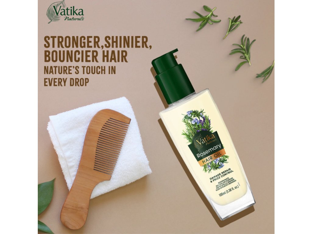 Směs vyživujících olejů v oleji Vatika Natural Rosemary Hair Oil pomáhá vyrovnat pH pokožky hlavy, zklidnit ji, posílit vlasová vlákna, osvěžit aromaterapeutickým účinkem a obnovit všechny typy vlasů. Zanechává je hebké, silné a bez krepatění.